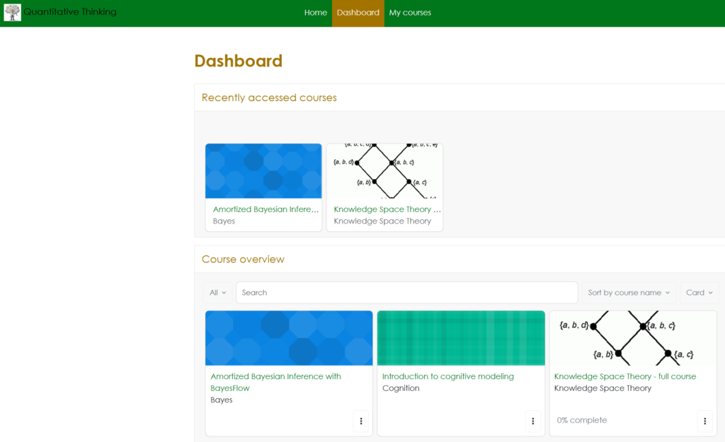 These OER include especially educational R Shiny apps, presentations, and Learnr tutorials which can also be selected through the tag clouds on the right and below. Furthermore, there is a course on knowledge space theory.